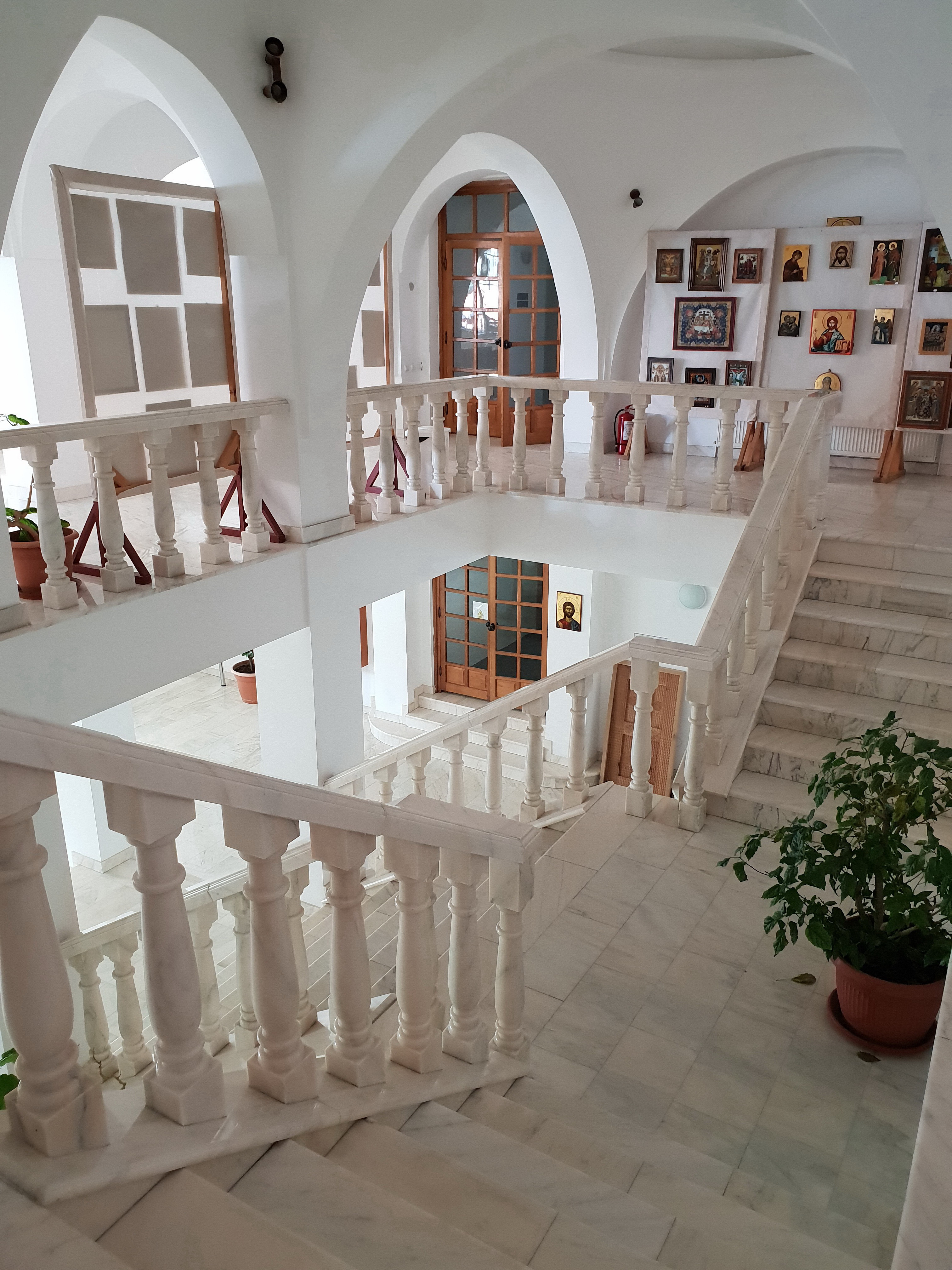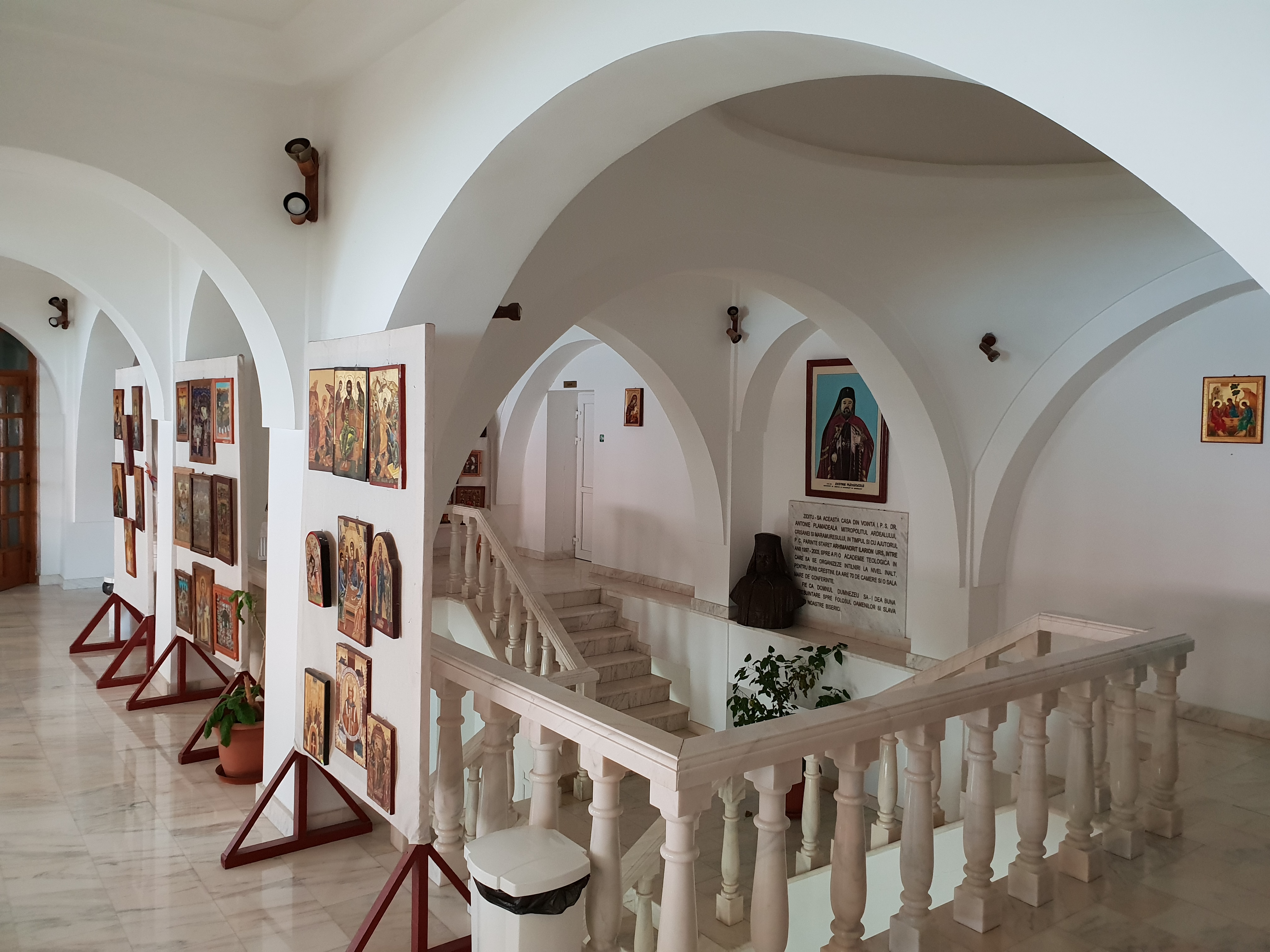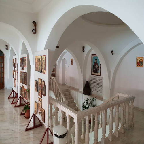 Triunghiul frontonului este decorat cu un mozaic reprezentând " Sfânta Treime de la Stejarul Mamvri", iar spatiul verde este amenajat cu alei luminate, gard viu, si central, un mic bazin din care tâsneste o frumoasa fântâna arteziana.